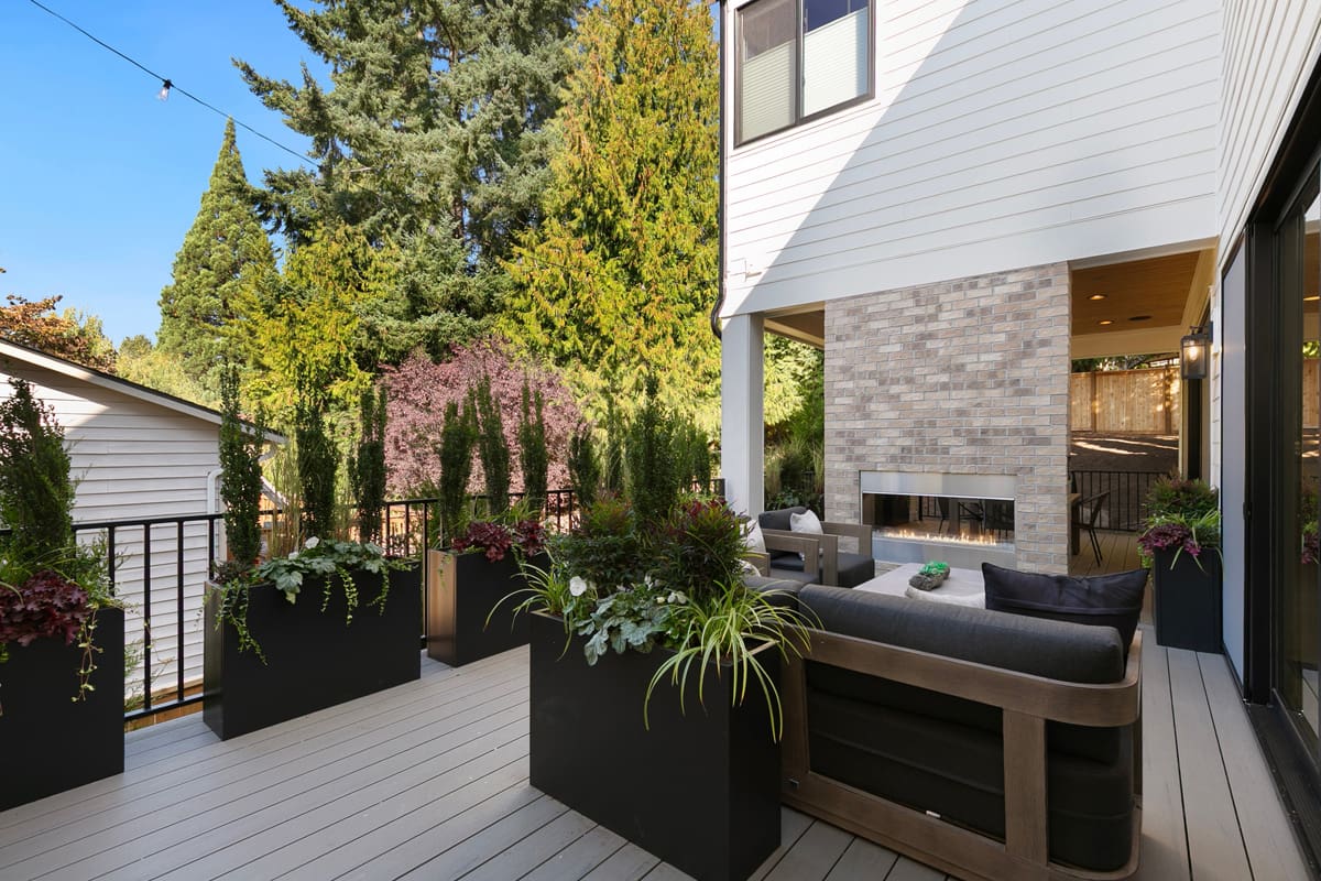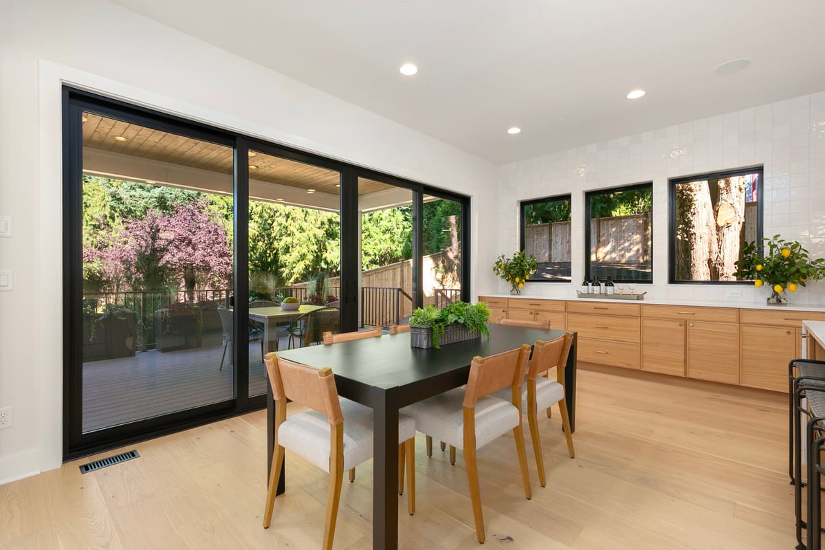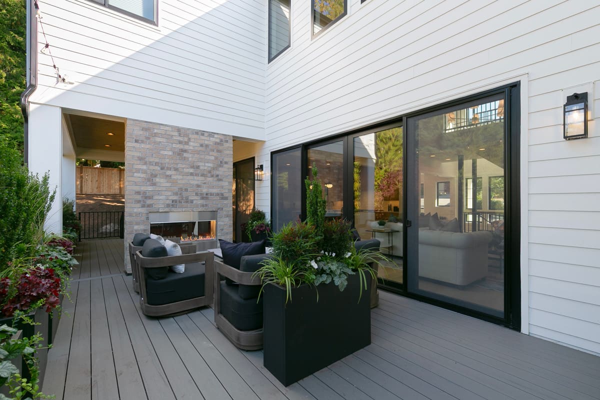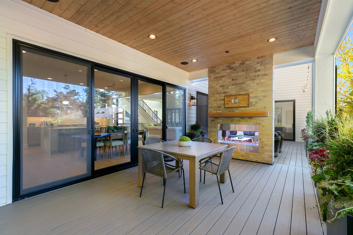 Indoor-Outdoor living w/ covered and uncovered space, double-sided fireplace, and stacking doors in the main living area